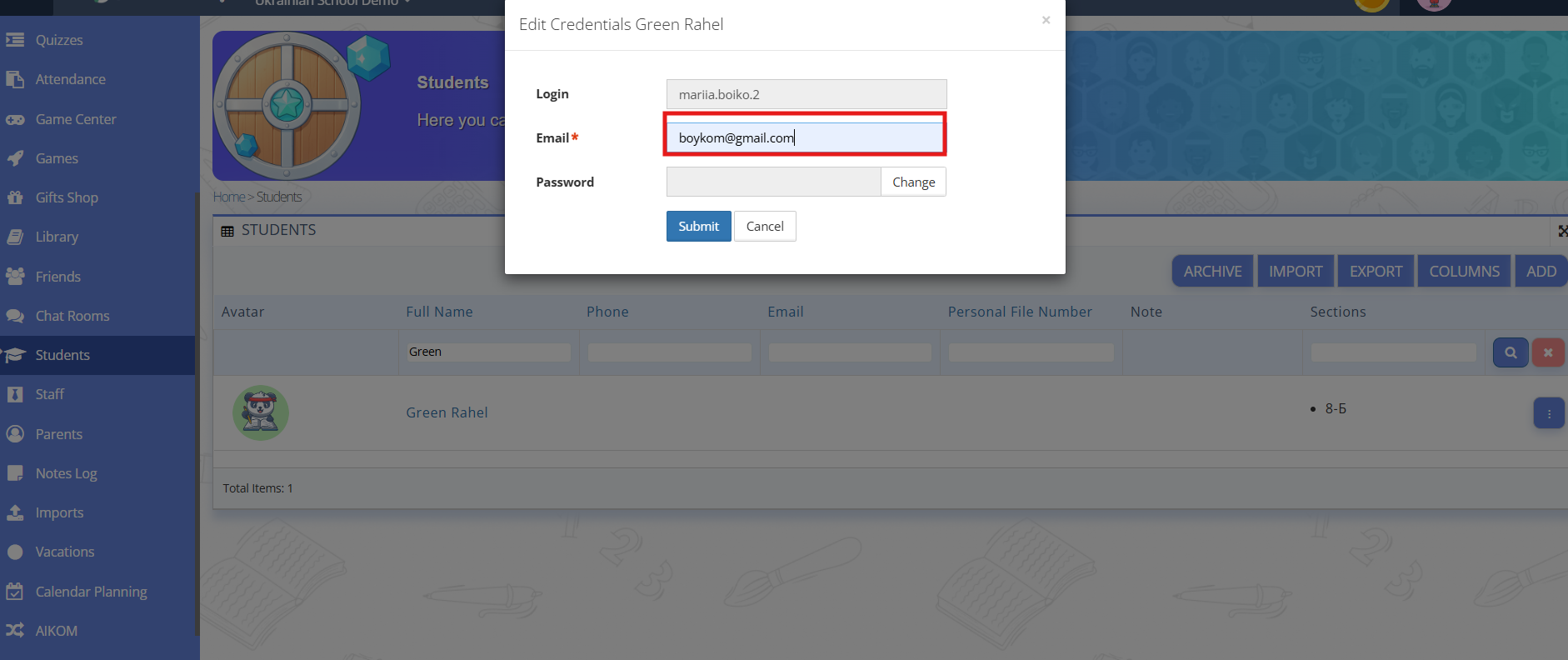 Go to “Students” in the left-hand menu and open the list of students. Use the search filter to find the required student.