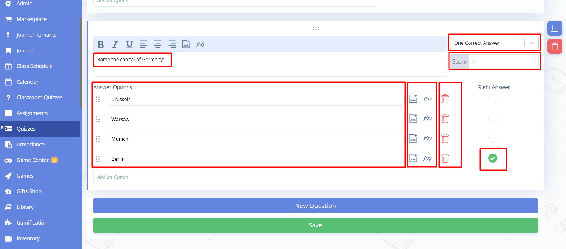 Fig. 7. Marks of correct answers, buttons for deleting answers, and saving the whole quiz