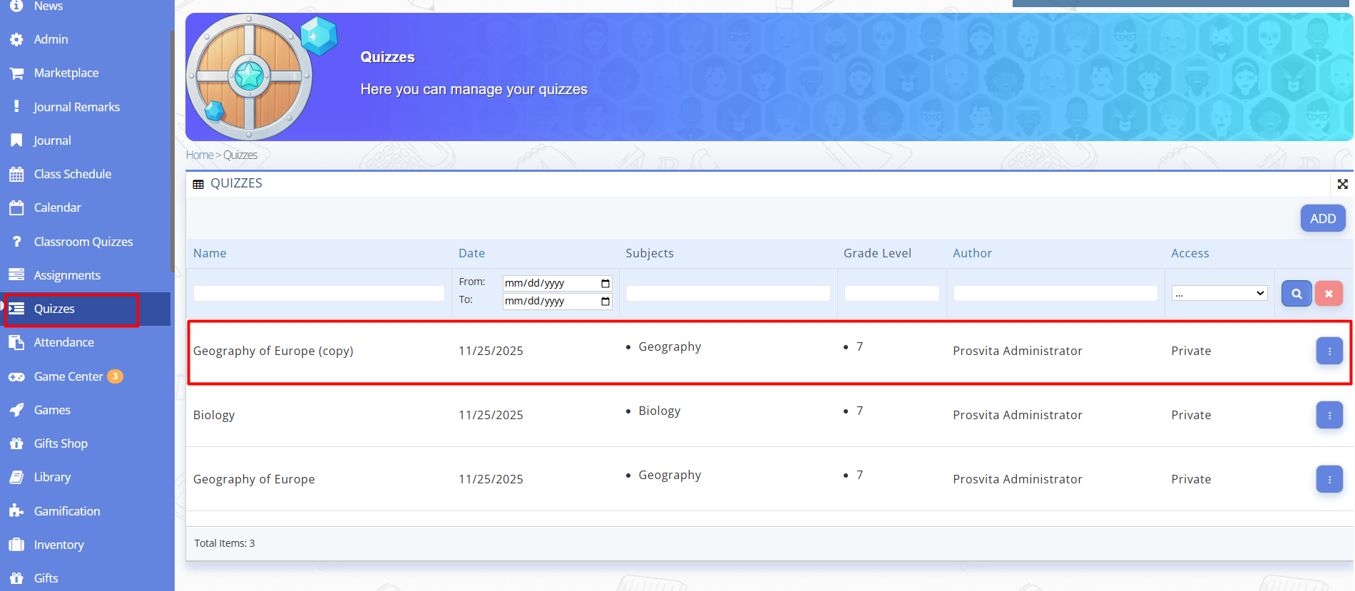 Duplicate Quiz Copying Quizzes¶ Steps¶ Go to “Quizzes” section. Find the quiz you want to duplicate. Click the three-dots menu next to the quiz. Select “Duplicate”. Fig. 1 — Duplicating a quiz A copy of the quiz will appear in the list. Fig. 2 — Duplicate of the previously created quiz