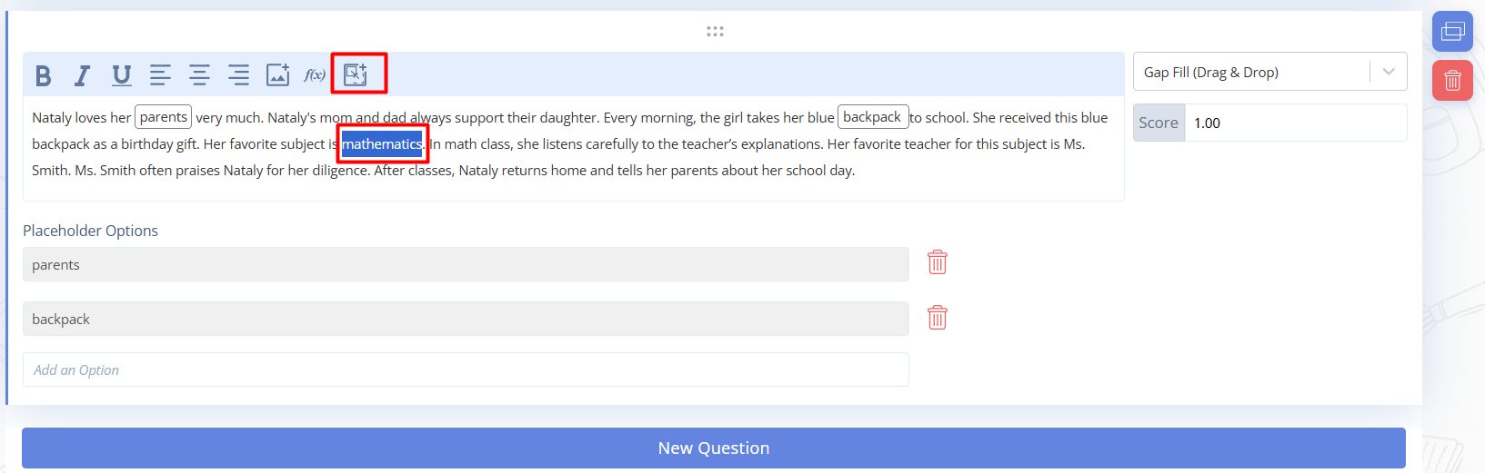 Gap Fill (input) is a text where some words or phrases are hidden and the student types them manually.