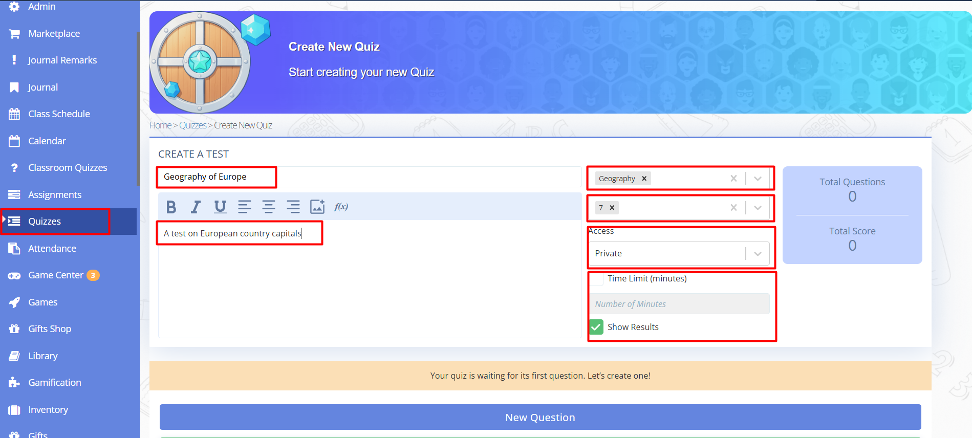 Fig. 7. View of the “Quizzes” page after creating a new quiz