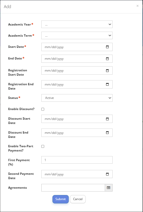 The date when the session or program officially ends (automatically pre-filled within the selected Academic Term). The session will automatically become inactive once the end date passes. - Registration Start Date