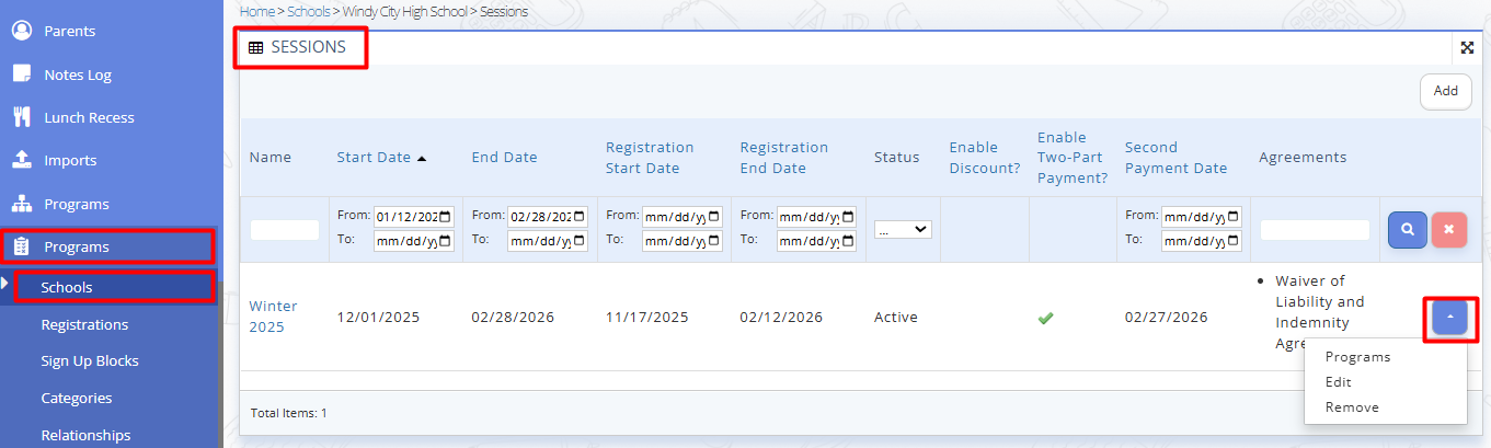 Manage Session Actions: Each Session in the list can be edited or removed. Additionally, you can access the School Programs page by clicking the 'Programs' option in the actions menu.