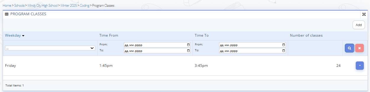 -- Set “Time To” range using the “From/To” fields.- 'Add' Button: Allows to add a new Program Class.