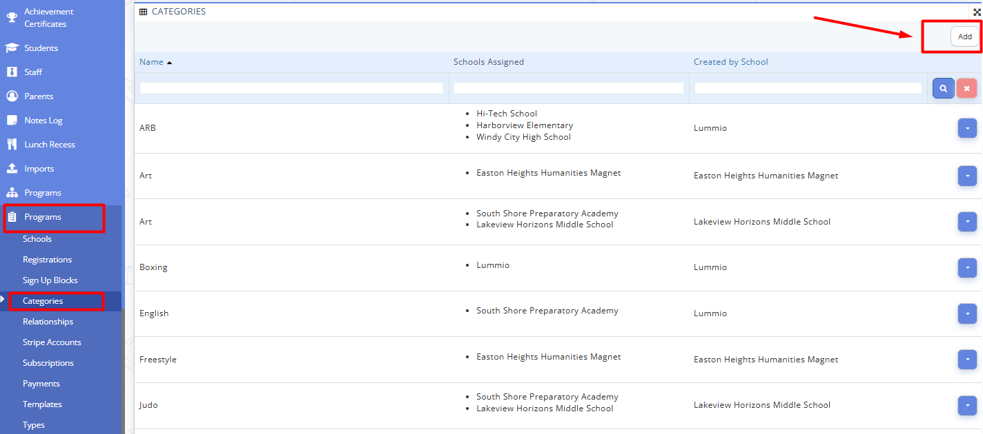 Categories is a section where you can view, search, add, and manage category records, including which schools they are assigned to and which school created them.