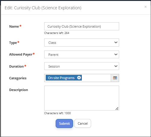 - Type (default types: before/after care, course, class or customized ones added by the school staff etc.)