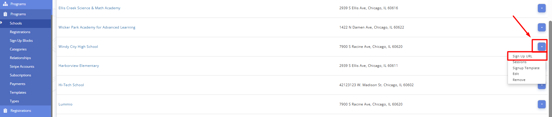 In the context menu to the specific school, click 'Sign Up URL' button.