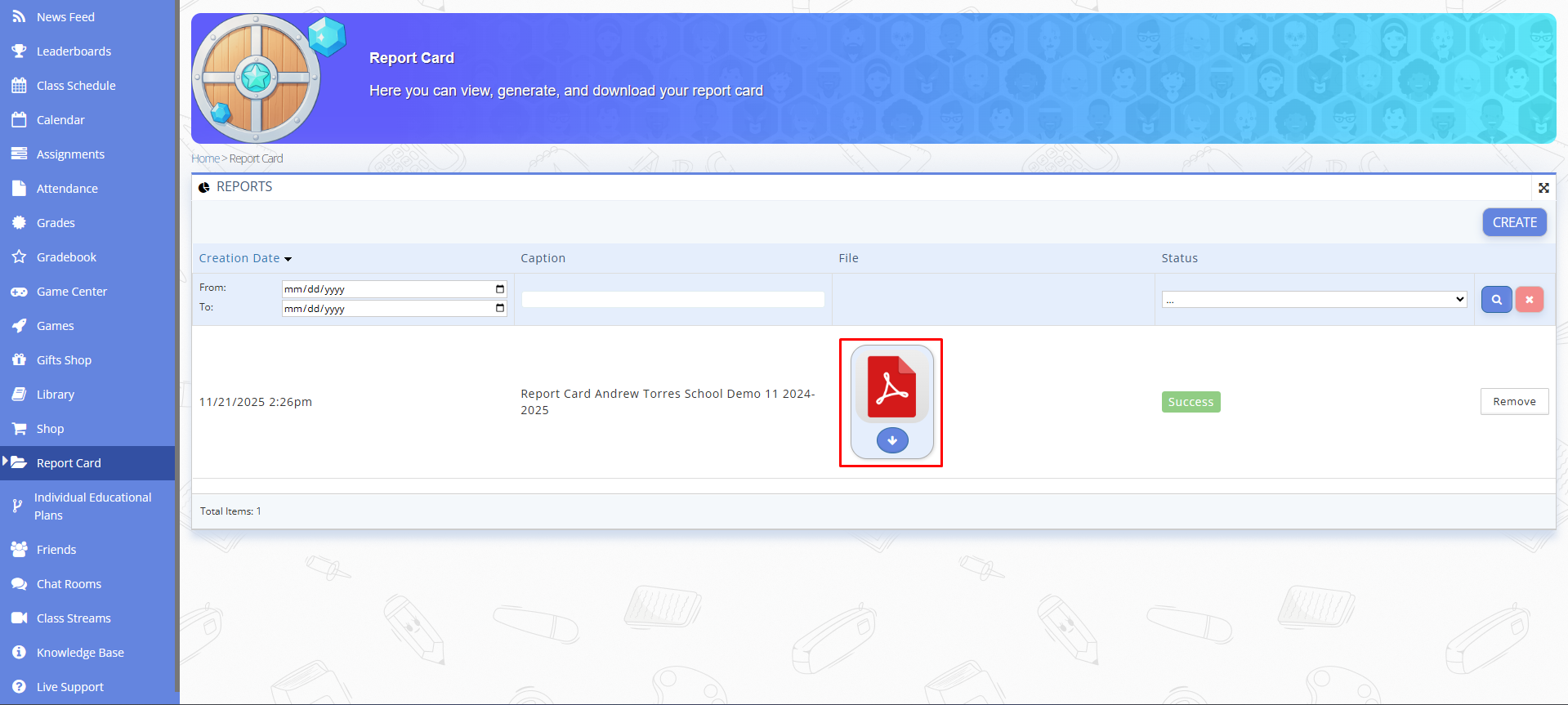 Fig. 3 — Report card file with “Pending” status - When the status changes to “Success”, click the blue arrow under the file icon to download the report card as a PDF file.