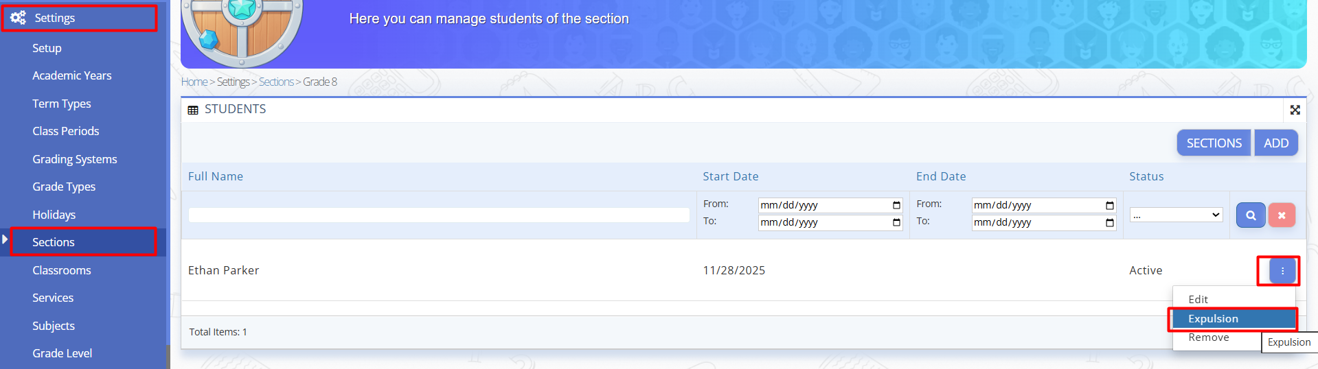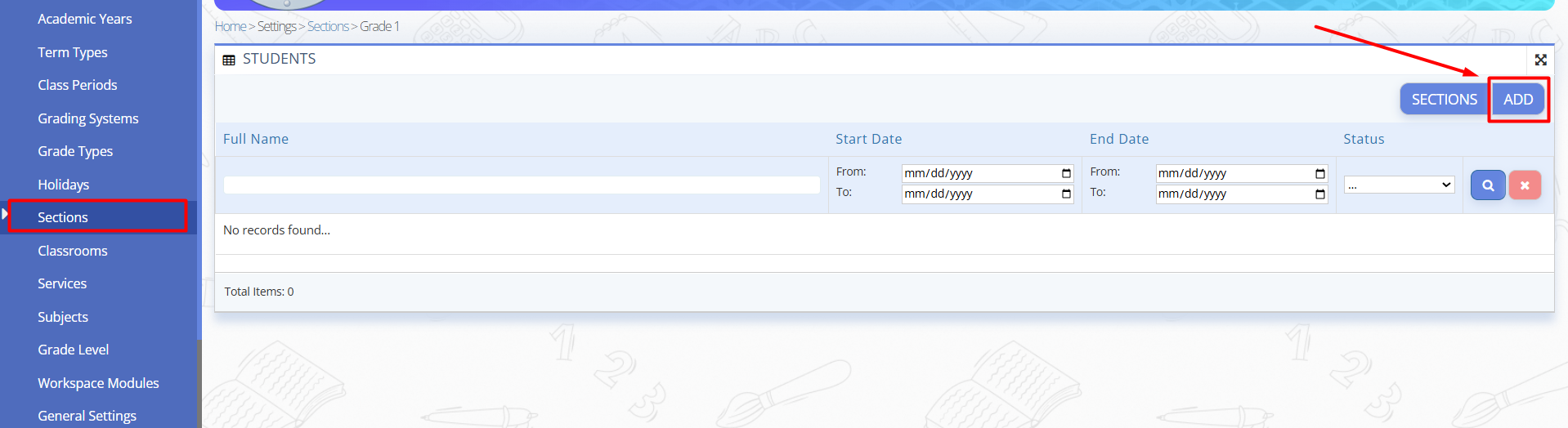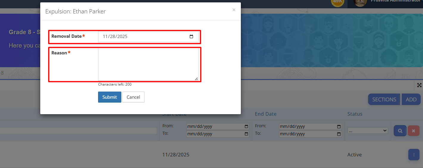 In the pop-up, enter the student’s last name, select them from the list, choose “Start Date” and click “Save”.