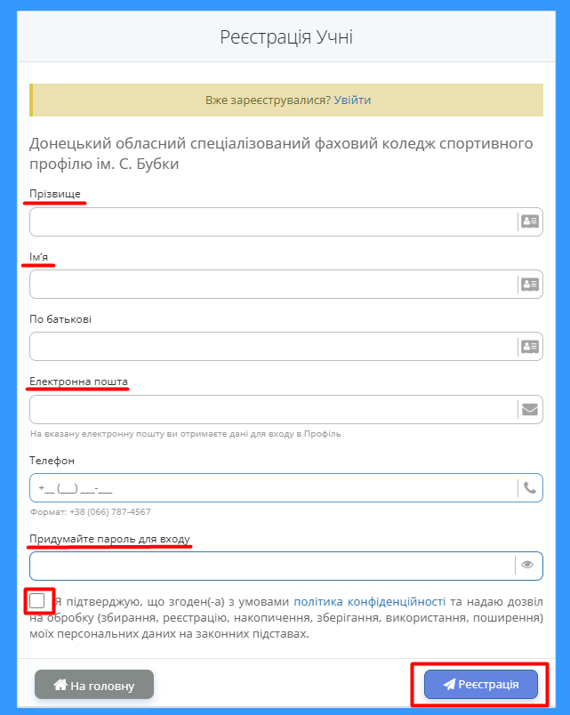 Рис. 1. Реєстрація учнів на платформі - Заповніть поля у формі реєстрації та натисніть кнопку "Реєстрація". Важливо, щоб прізвище, ім'я та по-батькові учня ідентично співпадало з вказаними даними, які попередньо вніс адміністратор навчального закладу на платформу.