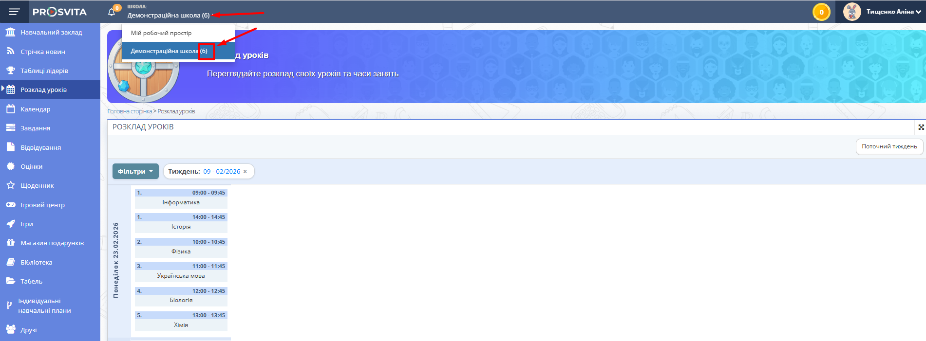 Рис. 3. Головна сторінка учнівського акаунту - Якщо учня вже додано до навчального класу, у шапці профілю біля назви навчального закладу в дужках буде вказано клас. Також в розділі "Розклад уроків" будуть назначені заняття.