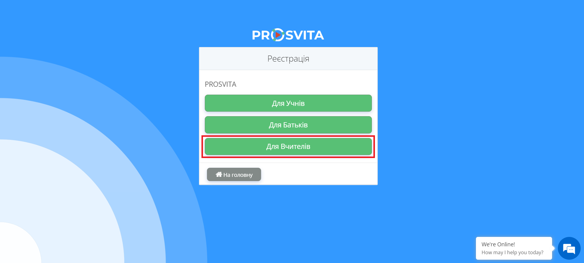- Оберіть роль. Натисніть кнопку "Для Вчителів" для ролей "Вчитель", "Директор", "Заступник" або "Адміністратор".