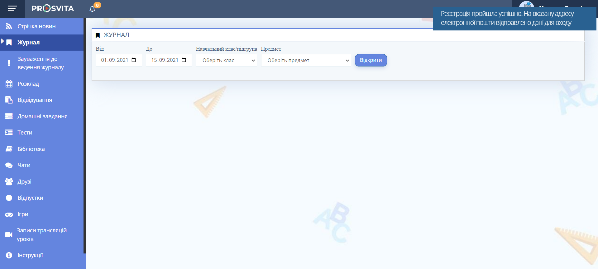 Рис. 2. Форма реєстрації для вчителів - Після реєстрації на пошту прийде лист з даними для входу. Відкриється внутрішній інтерфейс платформи.