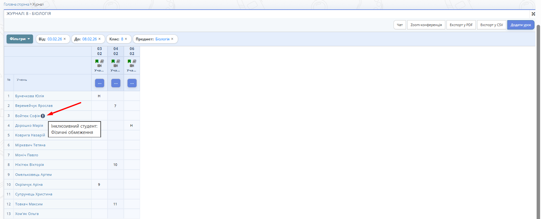 Рис. 1 — Відображення інклюзивного учня у списку в журналі