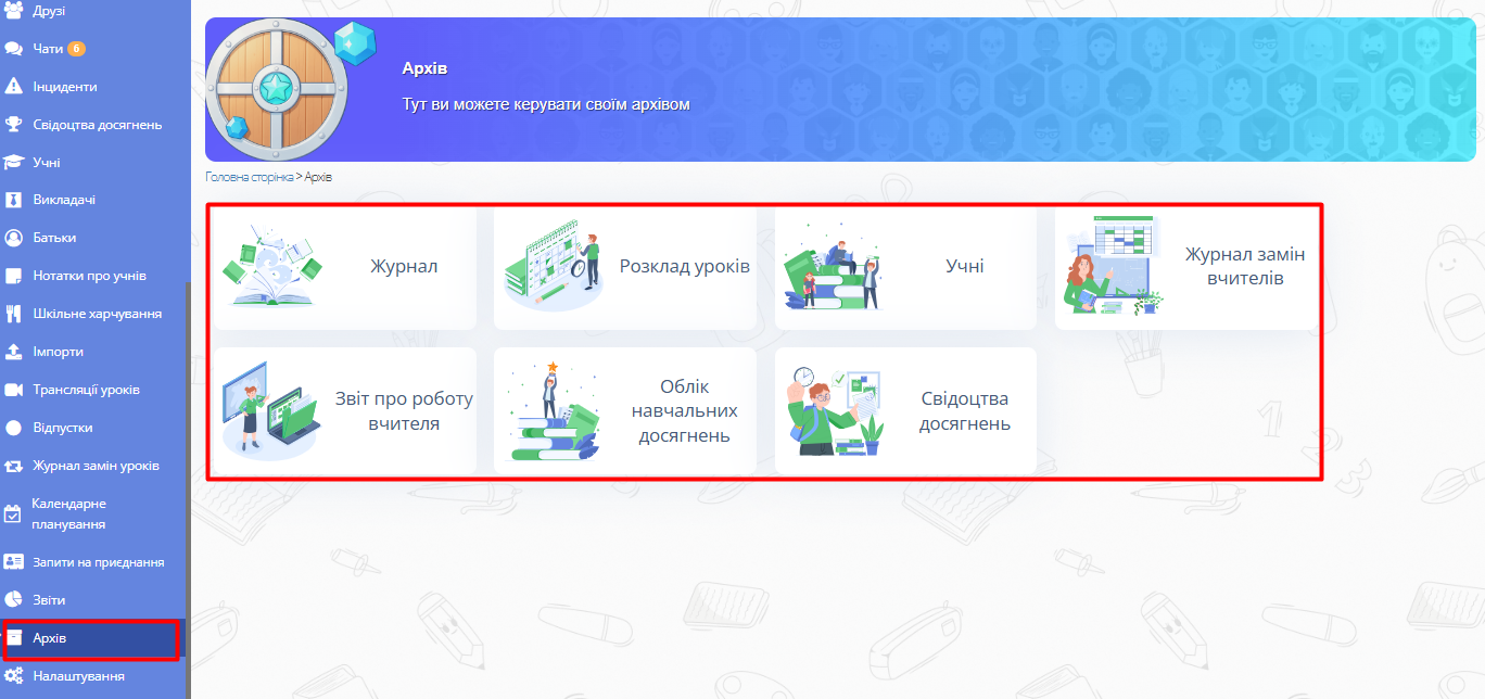 Розділ «Архів» надає доступ до історичних академічних записів із закритих навчальних років. Він дозволяє адміністраторам школи та уповноваженим співробітникам переглядати раніше фіналізовані дані, не впливаючи на інформацію поточного навчального року. Архів зберігає важливу документацію для звітності, аудитів та внутрішнього аналізу, забезпечуючи безперервність інституційних знань.