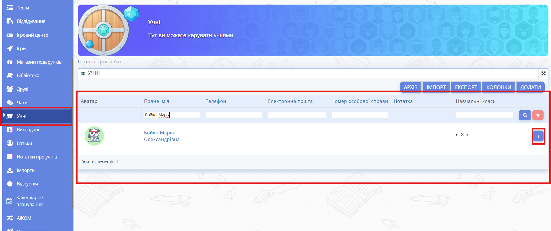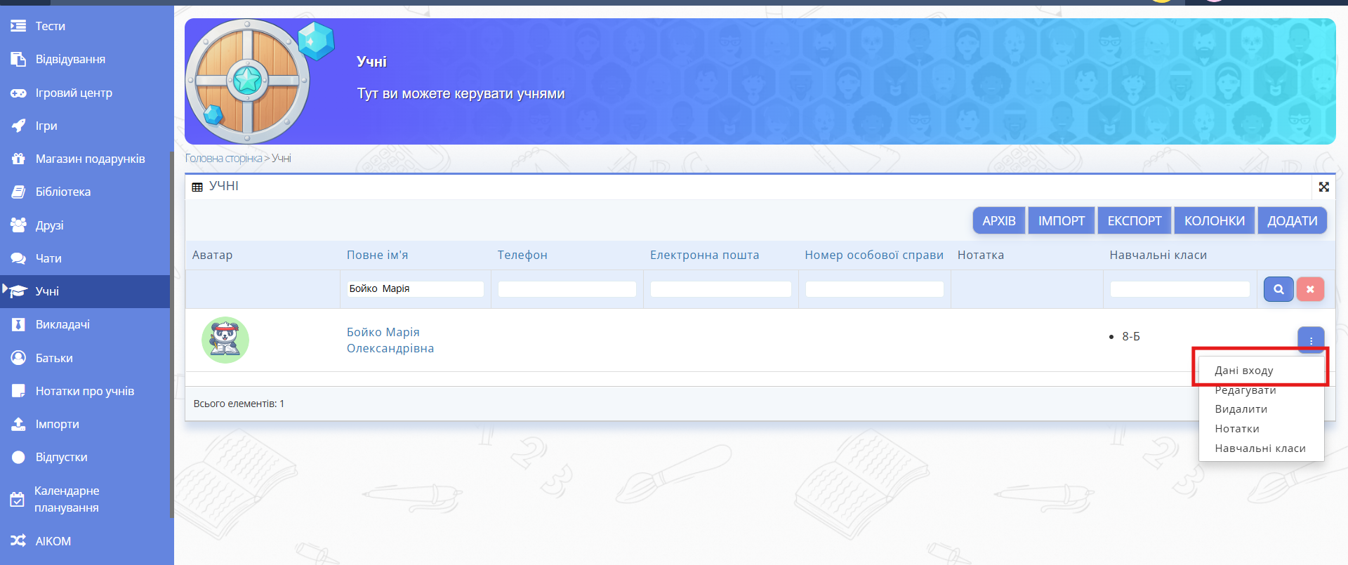 - У меню зліва перейдіть до розділу «Учні» та знайдіть потрібного учня за списком або за допомогою пошуку.