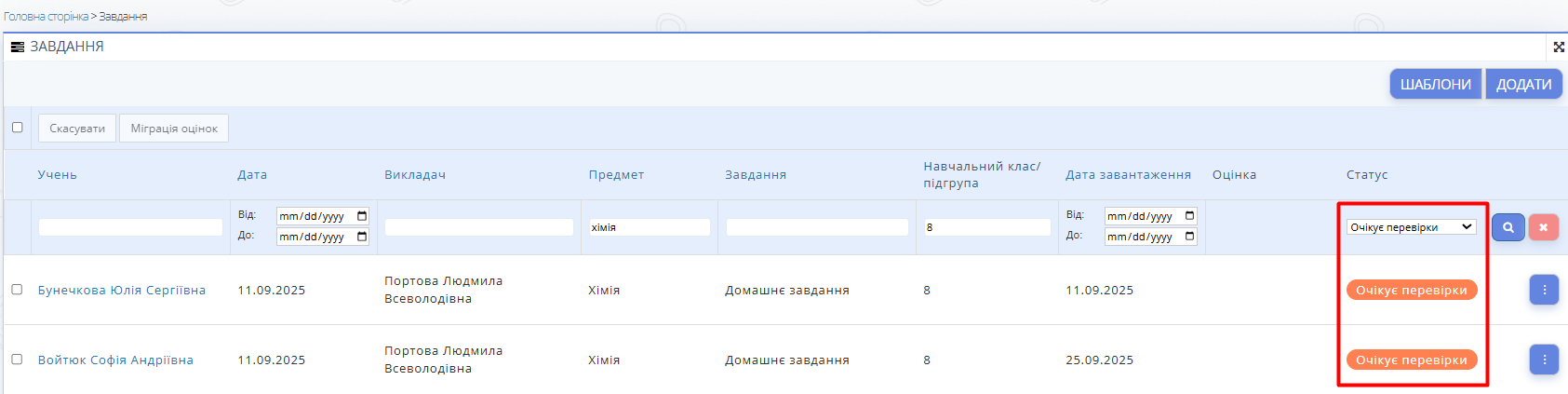 - Введіть параметри у поля фільтрів: дата, викладач, предмет, завдання, клас, дата завантаження, статус "Очікує перевірки".