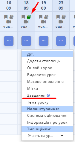 ℹ️ Якщо натиснути ... у колонці з уроком і обрати Тема уроку у випадаючому списку, відкриється вікно заповнення теми уроку, в якому також є опція додати тест. Якщо вчитель додає тест, тема уроку автоматично перетворюється у домашнє завдання.