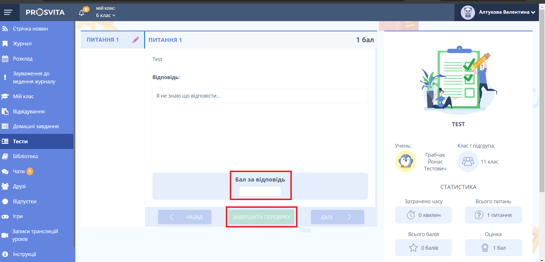 - Вкажіть оцінку, оберіть тип оцінки "Тест" та при необхідності оберіть "Виставити оцінку в журнал" для перенесення оцінки у журнал.
