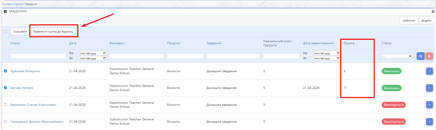 Рис. 1. Розділ "Завдання, кнопка "Перенести оцінку до журналу"