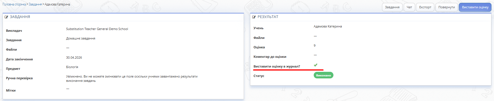 Оцінки, виставлені вчителем за виконані завдання, які назначались з розділу "Завдання" (а не Журнал) не переносяться автоматично до Журналу.