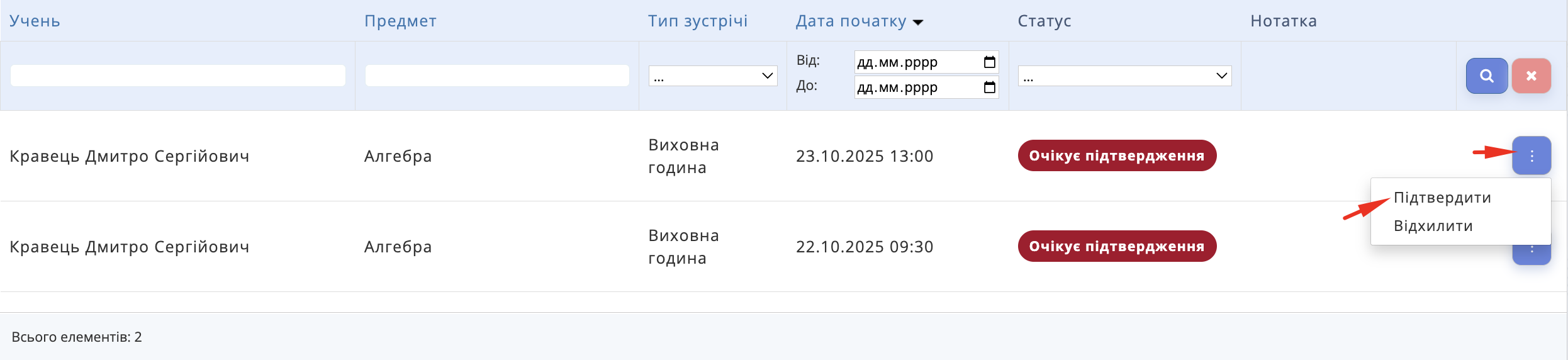 Рис. 1 — Меню дій над зустріччю - Оберіть дію: - «Підтвердити» — щоб погодити зустріч - «Відхилити» — щоб відмовити (за потреби вкажіть причину)