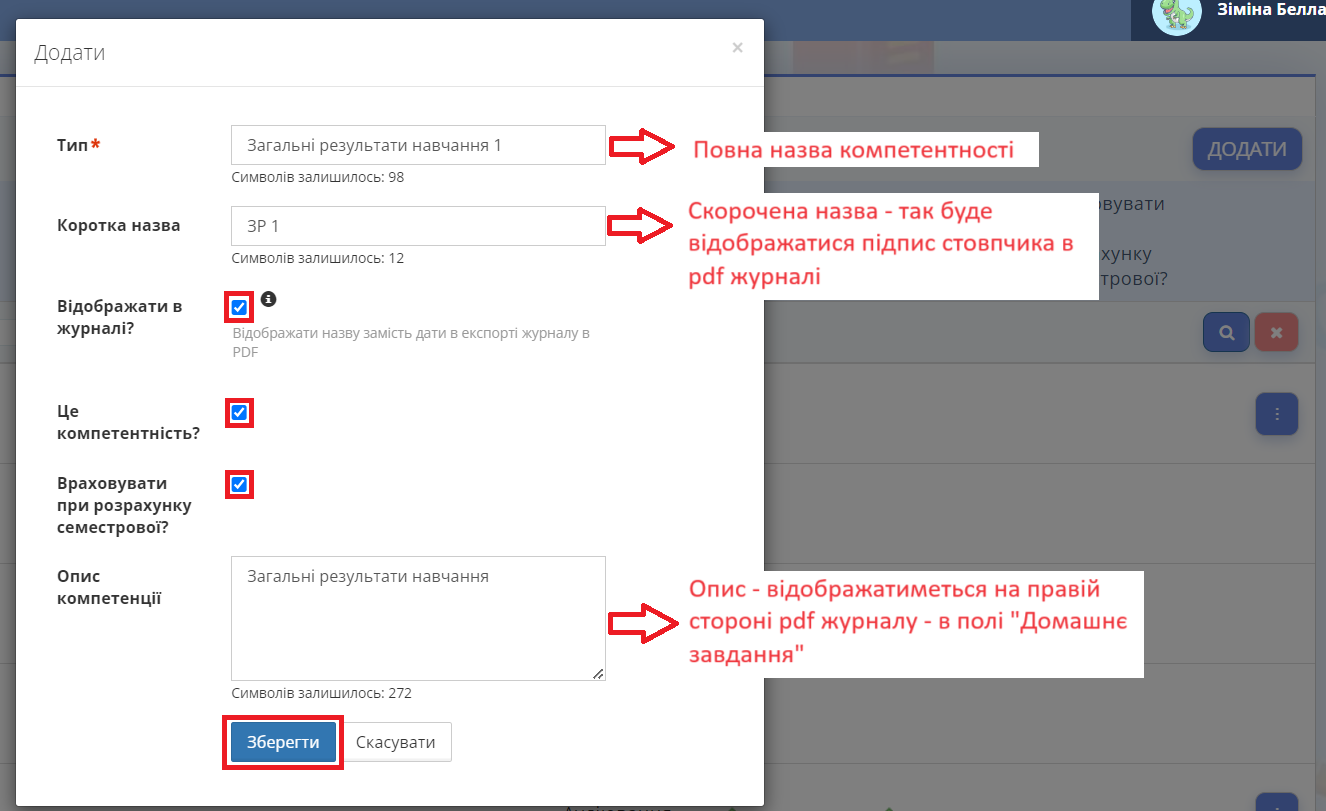 Введіть дані нового типу оцінювання: Тип, Коротка назва. Обов’язково поставте галочки біля “Відображати в журналі?”, “Це компетентність?”, “Враховувати при розрахунку семестрової?” (за потреби). Додайте опис компетенції. Натисніть Зберегти.