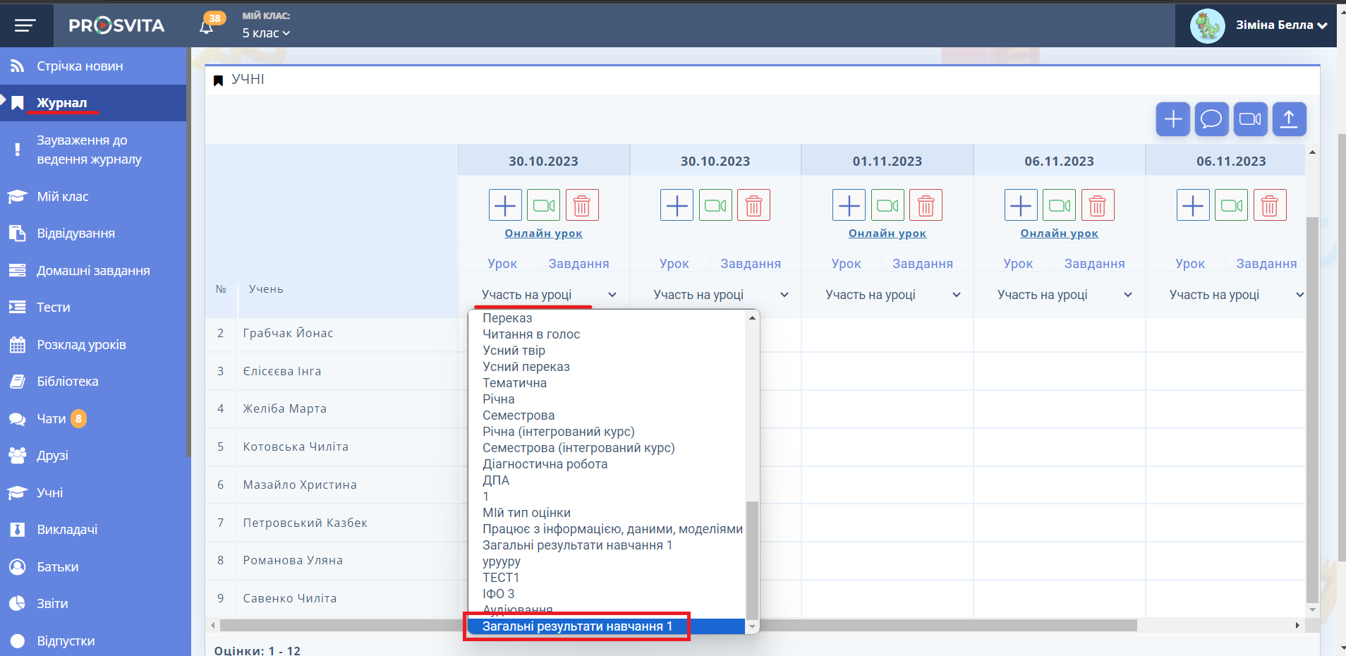 Після налаштувань адміністрацією закладу тип оцінювання з’явиться в загальному переліку. Викладач відкриває журнал потрібного класу, предмету, періоду і обирає відповідний тип оцінювання.