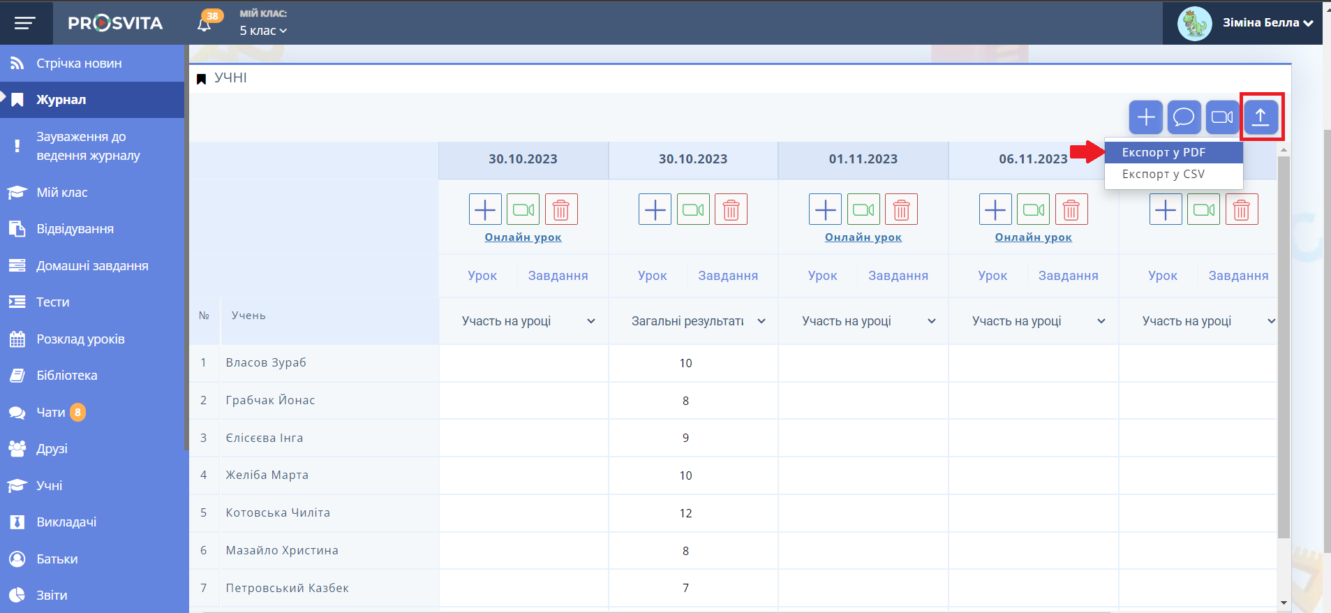 Обравши тип оцінювання, виставте оцінки “Н”. Інформація зберігається автоматично. Для перегляду pdf-журналу натисніть Експорт у PDF.