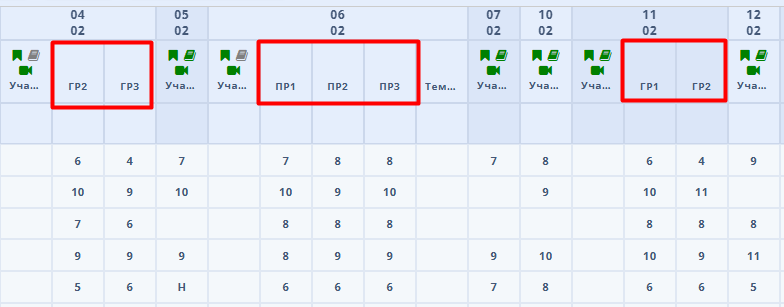 Обравши тип оцінювання, виставте оцінки або “Н”. Інформація зберігається автоматично. Ось як будуть виглядати обрані компетенції у стовпчиках журналу: