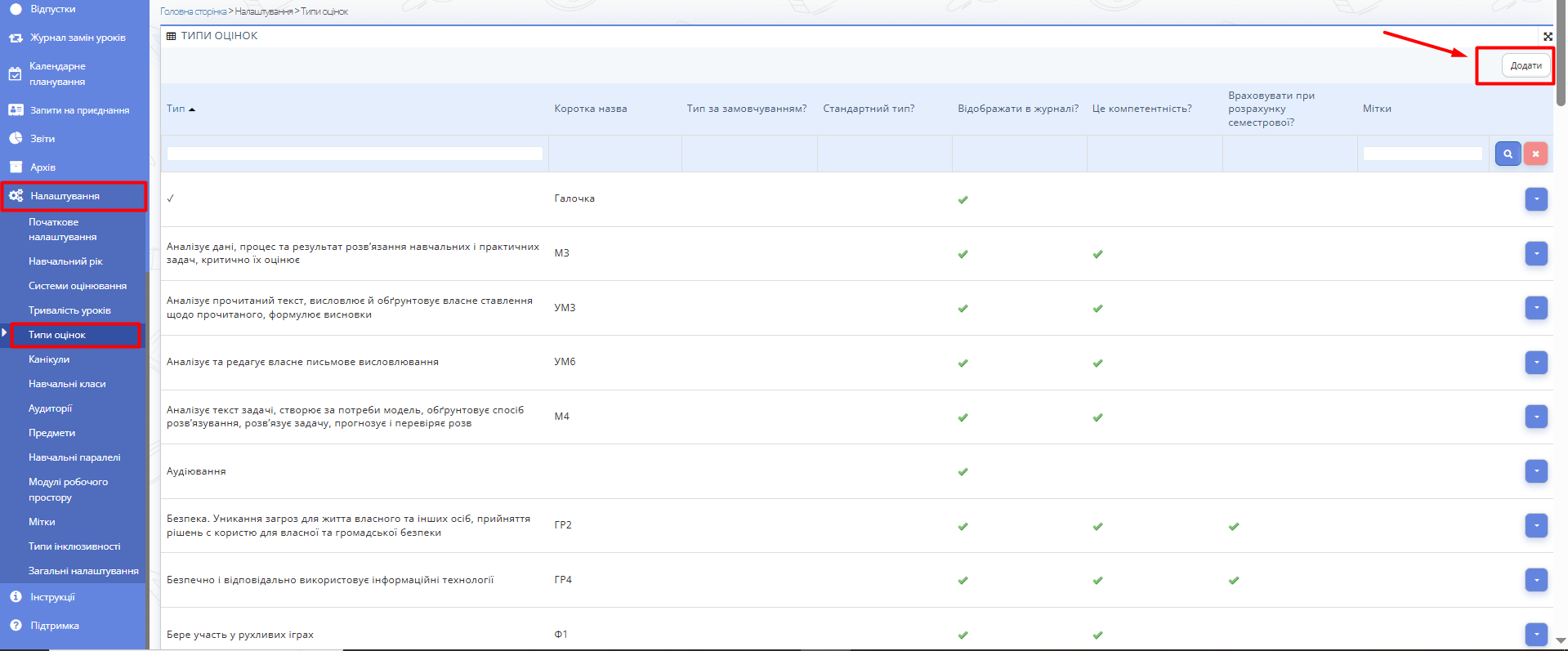Створіть новий тип оцінювання. Перейдіть у меню Налаштування, оберіть секцію Типи оцінок, натисніть "Додати" у правому верхньому кутку сторінки.