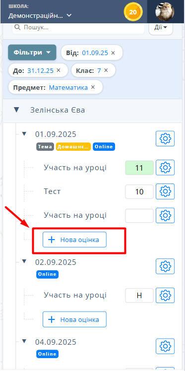 - Додавання оцінки Натисніть «+ Нова оцінка», щоб: