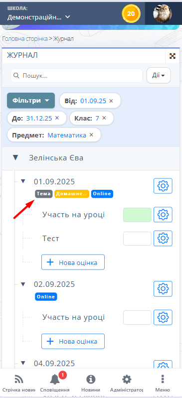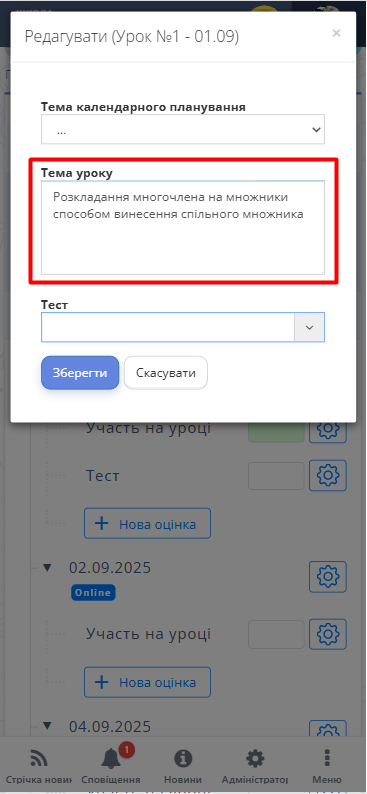 - Після збереження теми, ярлик "Тема" з'явиться під датою уроку, а в меню налаштувань уроку біля "Тема уроку" з'явиться галочка.