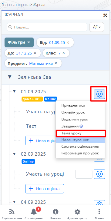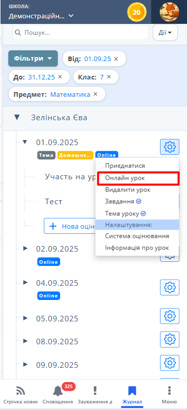 Переглянути інформацію по уроку, можна, натиснувши ⚙️ біля дати уроку та обравши "Інформація про урок" у випадаючому списку.
