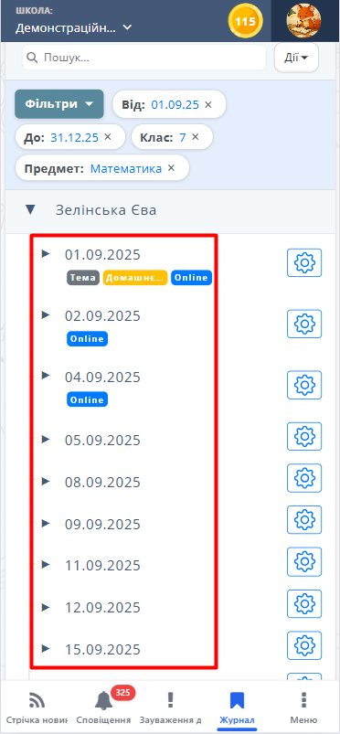 Відображається перелік учнів класу. Для кожного учня показані записи за датами уроків.