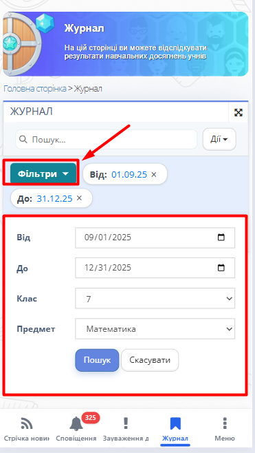 Мобільний журнал — це робочий розділ застосунку, у якому вчитель веде облік уроків, відвідування та оцінювання учнів безпосередньо зі смартфона. Він дозволяє швидко внести оцінки під час уроку, переглянути попередні записи та виконати основні дії з уроком.
