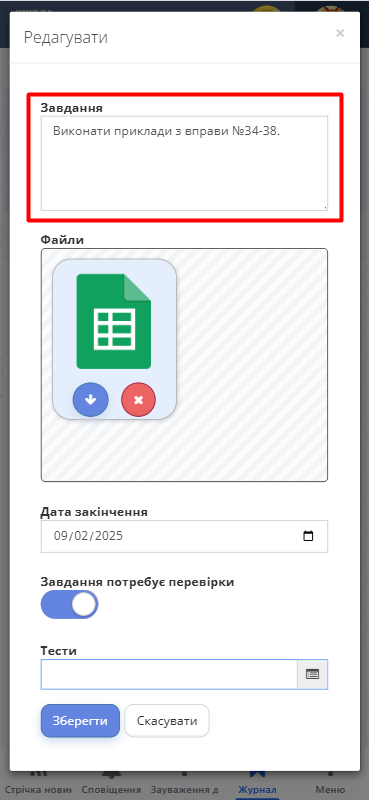 Рисунок 12: Вікно заповнення завдання в мобільному журналі -