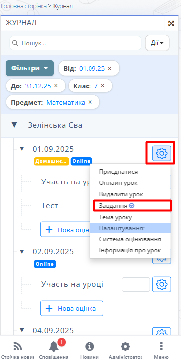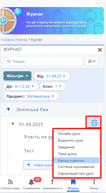 1. Натисніть на іконку налаштувань ⚙️ біля дати уроку.