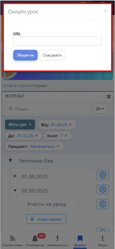 Щоб додати online-посилання на урок в мобільному журналі, необхідно: