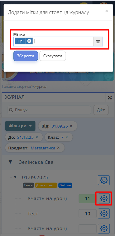 1. Натисніть на іконку налаштувань ⚙️ біля клітинки з оцінкою.