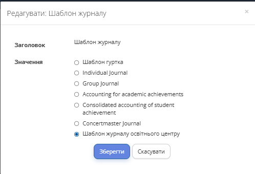 Рис. 6 — Редагування шаблону журналу - У вікні Редагувати: Шаблон журналу виберіть потрібний варіант і натисніть Зберегти.