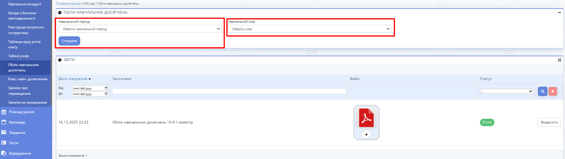 - Виберіть навчальний період та навчальний клас на сторінці "Мій клас" -> "Облік навчальних досягнень".
