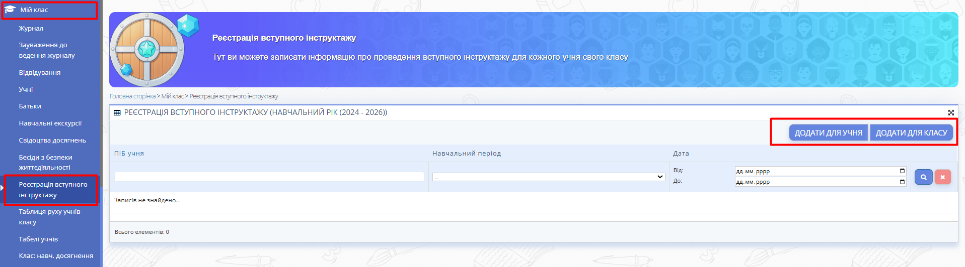 Перейдіть у розділ «Мій клас» → «Реєстрація вступного інструктажу».
