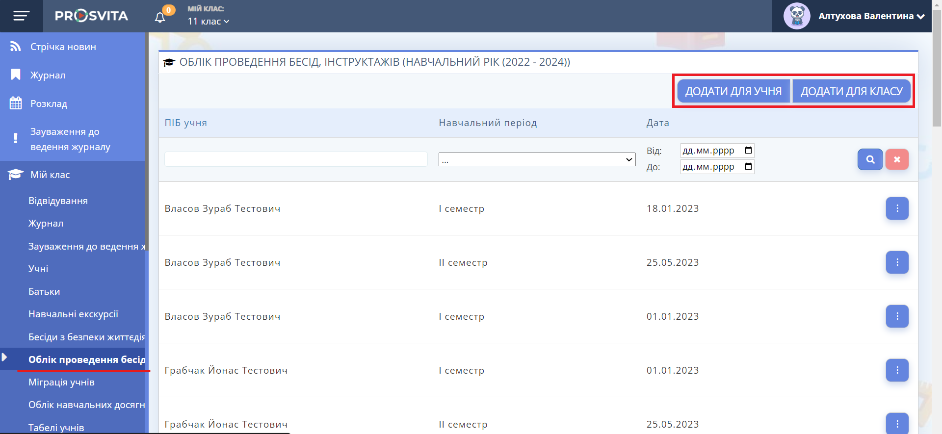 - Щоб додати запис для всього класу, натисніть кнопку "Додати для класу" у верхній частині сторінки.