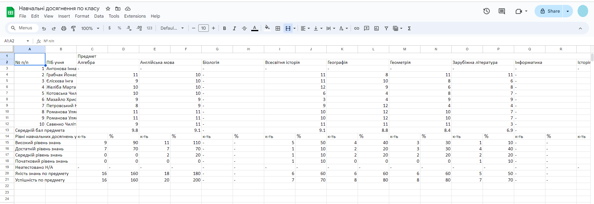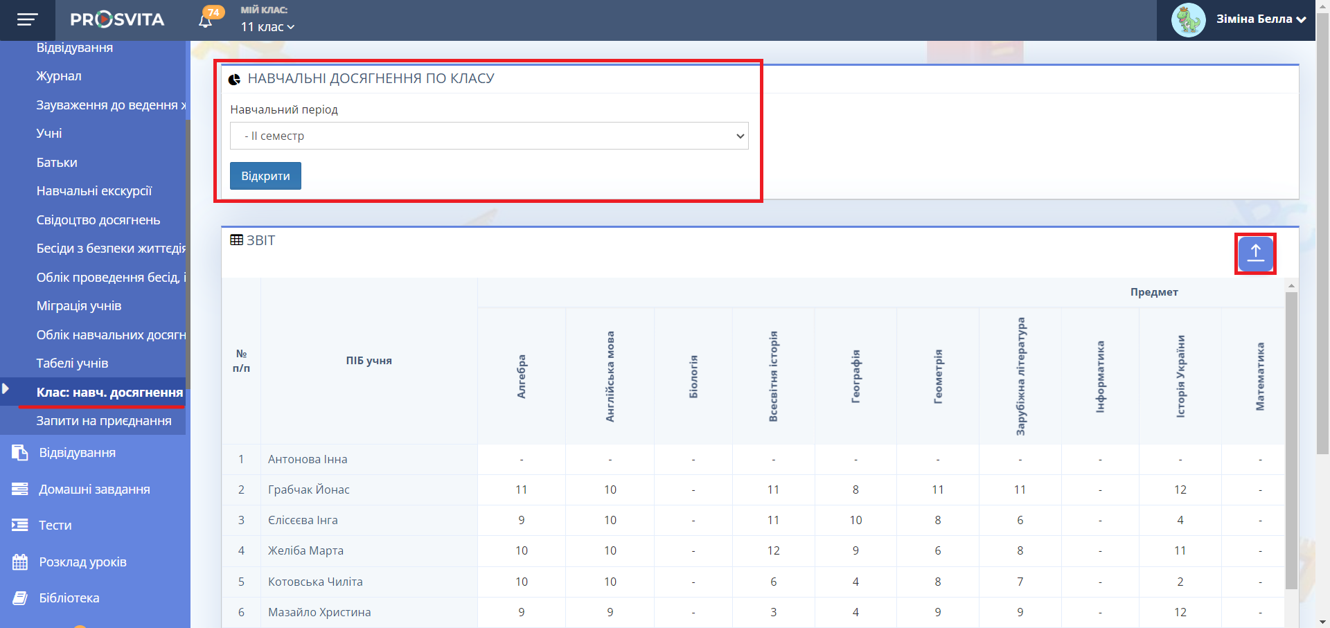 - Перегляньте звіт із переліком учнів та їхніми оцінками з усіх предметів.