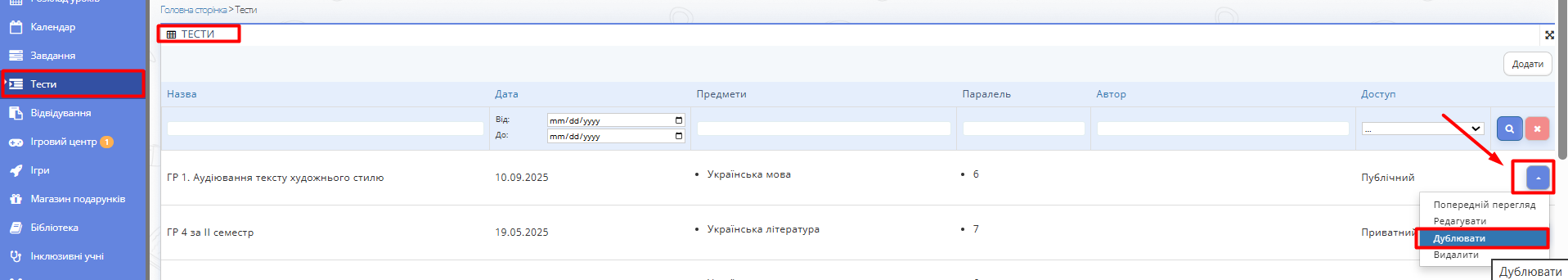 - Перейдіть у розділ "Тести" в головному меню.