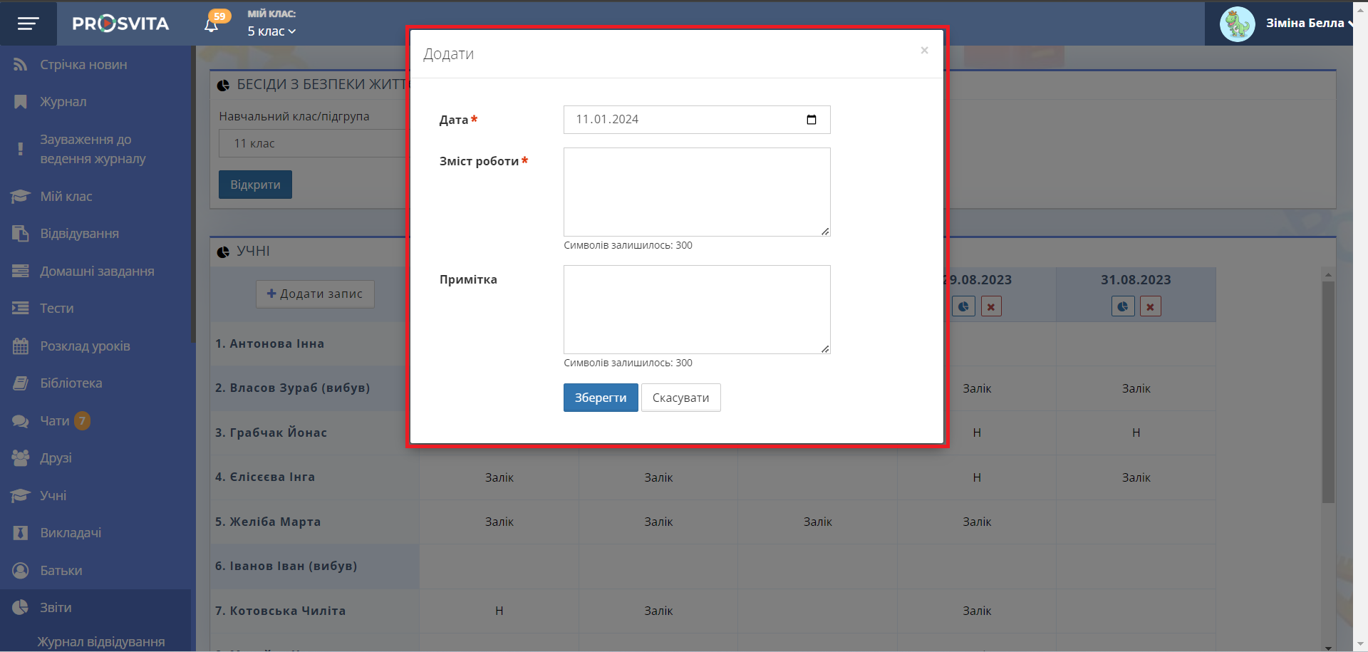 - Перегляньте список учнів класу, дати проведення бесід та відмітки про залік або відсутність учнів.