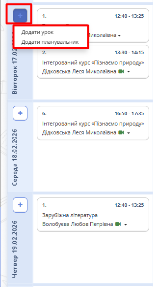 Рис. 8 — Можливості кнопки - Для додавання уроку на будь-який навчальний період, натисніть кнопку "Додати Планувальник". Відкриється вікно редагування для внесення змін на обраний період.