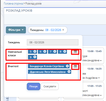 Натисніть кнопку "Поточний тиждень" для переходу на сторінку з розкладом поточного тижня. - Відсортуйте у фільтрі розклад уроків за датою, навчальним класом (класами) та прізвищем вчителя (вчителів).