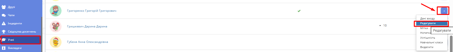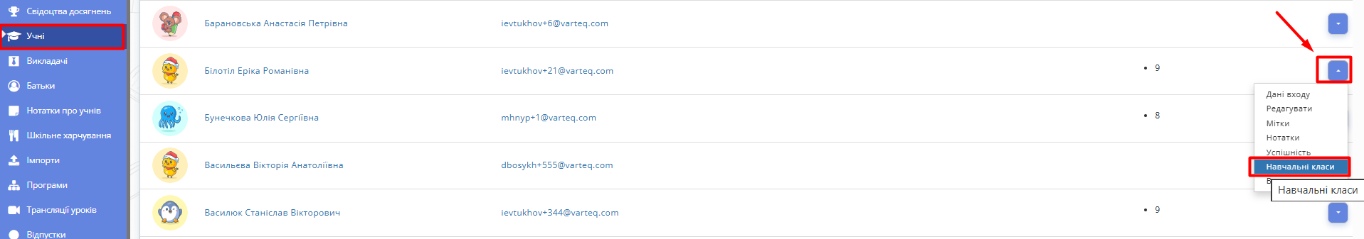 2.1. Перейдіть у розділ "Учні". Оберіть потрібного учня. Натисніть кнопку контекстного меню праворуч та оберіть "Навчальні класи".